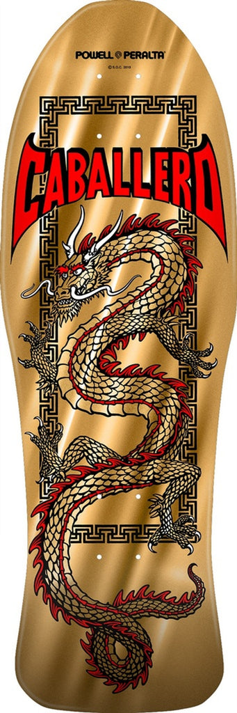 After a six year run, it was time to change up Caballero's deck graphic. Just in time for the filming of the Animal Chin video in 1986, a new dragon graphic was created for Cab. Now known as the Cab Chinese Dragon, the artwork was inspired by a Chinese takeout box and finally illustrated by VCJ. The Chinese Dragon came on a new "fish" shape in full size and mini. It was produced as 7-ply maple and also "Bonite" construction. It was discontinued in 1987.